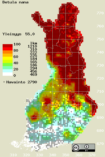 Tämä on vuoden 2017 kasviatlaksen karttasivu taksonista Betula nana. Tästä taksonista voi olla karttoja myös muissa atlaksen vuosiversioissa: 2018 / 2017 / 2016 / 2015 / 2014 / 2013 / 2012 / 2011 / 2010 / 2009 / 2008 / 2007 / 2006.