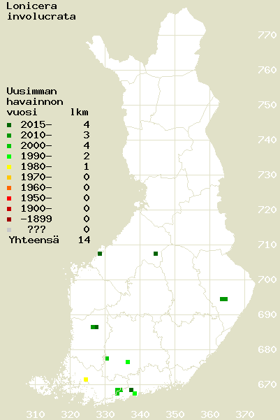 Tämä on jatkuvasti päivittyvä kasviatlaksen karttasivu taksonista Lonicera involucrata. Tästä taksonista voi olla karttoja eri vuosien atlaksissa: 2018 / 2017 / 2016 / 2015 / 2014 / 2013 / 2012 / 2011 / 2010 / 2009 / 2008 / 2007 / 2006.