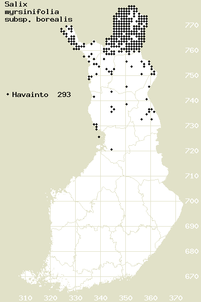 Tämä on jatkuvasti päivittyvä kasviatlaksen karttasivu taksonista Salix myrsinifolia subsp. borealis. Tästä taksonista voi olla karttoja eri vuosien atlaksissa: 2018 / 2017 / 2016 / 2015 / 2014 / 2013 / 2012 / 2011 / 2010 / 2009 / 2008 / 2007 / 2006.