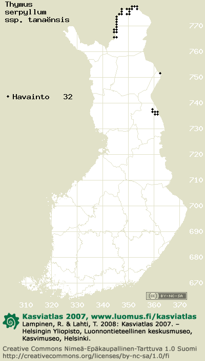 Tämä on vuoden 2006 kasviatlaksen karttasivu taksonista Thymus serpyllum ssp. tanaënsis. Tästä taksonista voi olla karttoja myös muissa atlaksen vuosiversioissa: 2018 / 2017 / 2016 / 2015 / 2014 / 2013 / 2012 / 2011 / 2010 / 2009 / 2008 / 2007 / 2006.