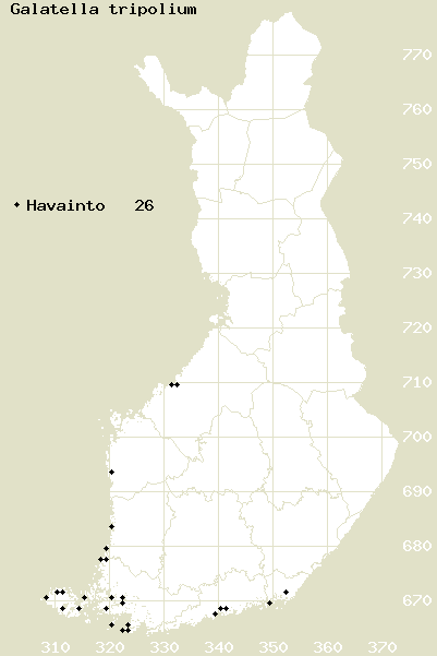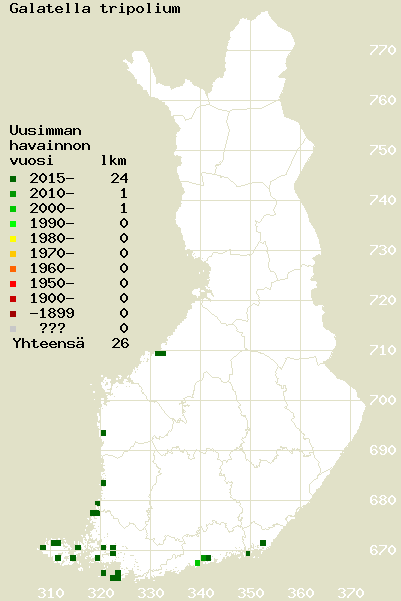 Tämä on jatkuvasti päivittyvä kasviatlaksen karttasivu taksonista Galatella tripolium. Tästä taksonista voi olla karttoja eri vuosien atlaksissa: 2018 / 2017 / 2016 / 2015 / 2014 / 2013 / 2012 / 2011 / 2010 / 2009 / 2008 / 2007 / 2006.