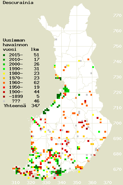Tämä on jatkuvasti päivittyvä kasviatlaksen karttasivu taksonista Descurainia. Tästä taksonista voi olla karttoja eri vuosien atlaksissa: 2018 / 2017 / 2016 / 2015 / 2014 / 2013 / 2012 / 2011 / 2010 / 2009 / 2008 / 2007 / 2006.