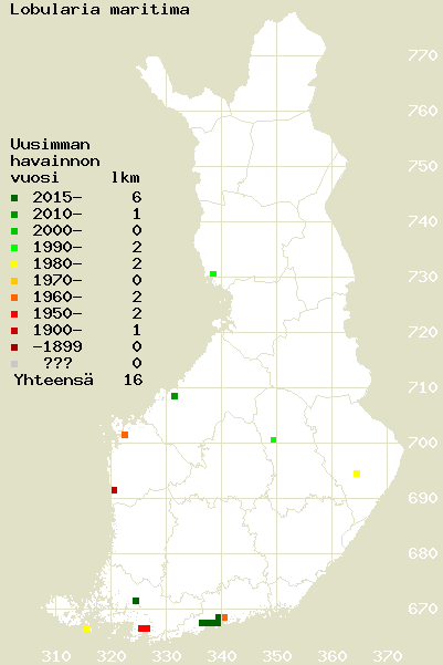 Tämä on jatkuvasti päivittyvä kasviatlaksen karttasivu taksonista Lobularia maritima. Tästä taksonista voi olla karttoja eri vuosien atlaksissa: 2018 / 2017 / 2016 / 2015 / 2014 / 2013 / 2012 / 2011 / 2010 / 2009 / 2008 / 2007 / 2006.