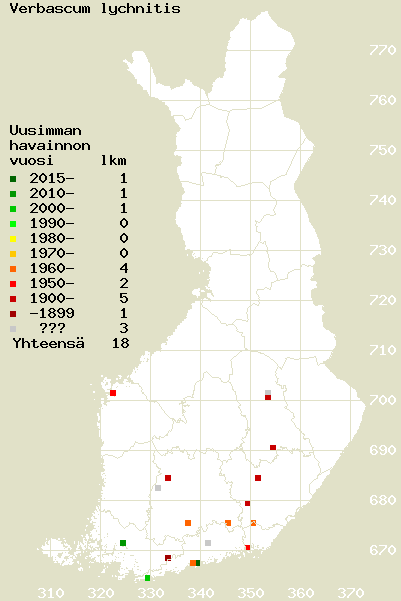 Tämä on jatkuvasti päivittyvä kasviatlaksen karttasivu taksonista Verbascum lychnitis. Tästä taksonista voi olla karttoja eri vuosien atlaksissa: 2018 / 2017 / 2016 / 2015 / 2014 / 2013 / 2012 / 2011 / 2010 / 2009 / 2008 / 2007 / 2006.