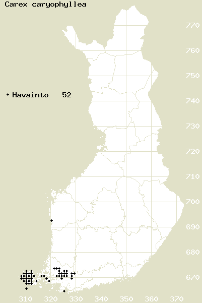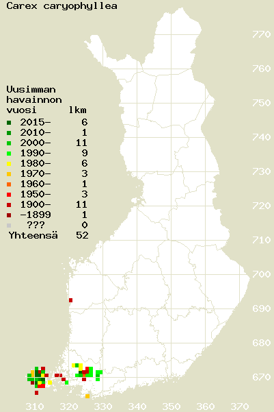 Tämä on jatkuvasti päivittyvä kasviatlaksen karttasivu taksonista Carex caryophyllea. Tästä taksonista voi olla karttoja eri vuosien atlaksissa: 2018 / 2017 / 2016 / 2015 / 2014 / 2013 / 2012 / 2011 / 2010 / 2009 / 2008 / 2007 / 2006.