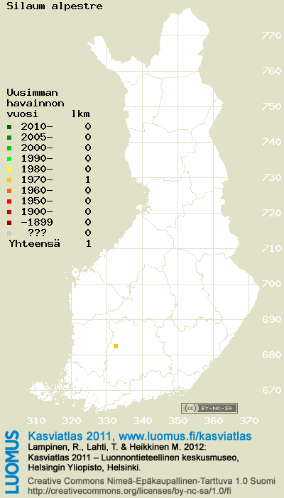 Tämä on vuoden 2011 kasviatlaksen karttasivu taksonista Silaum alpestre. Tästä taksonista voi olla karttoja myös muissa atlaksen vuosiversioissa: 2018 / 2017 / 2016 / 2015 / 2014 / 2013 / 2012 / 2011 / 2010 / 2009 / 2008 / 2007 / 2006.