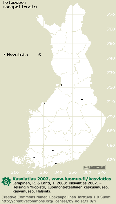 Tämä on vuoden 2006 kasviatlaksen karttasivu taksonista Polypogon monspeliensis. Tästä taksonista voi olla karttoja myös muissa atlaksen vuosiversioissa: 2018 / 2017 / 2016 / 2015 / 2014 / 2013 / 2012 / 2011 / 2010 / 2009 / 2008 / 2007 / 2006.