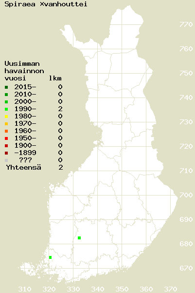 Tämä on jatkuvasti päivittyvä kasviatlaksen karttasivu taksonista Spiraea ×vanhouttei. Tästä taksonista voi olla karttoja eri vuosien atlaksissa: 2018 / 2017 / 2016 / 2015 / 2014 / 2013 / 2012 / 2011 / 2010 / 2009 / 2008 / 2007 / 2006.
