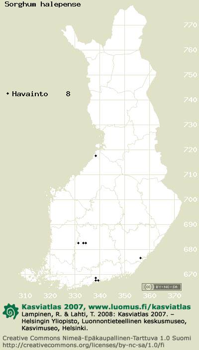 Tämä on vuoden 2006 kasviatlaksen karttasivu taksonista Sorghum halepense. Tästä taksonista voi olla karttoja myös muissa atlaksen vuosiversioissa: 2018 / 2017 / 2016 / 2015 / 2014 / 2013 / 2012 / 2011 / 2010 / 2009 / 2008 / 2007 / 2006.