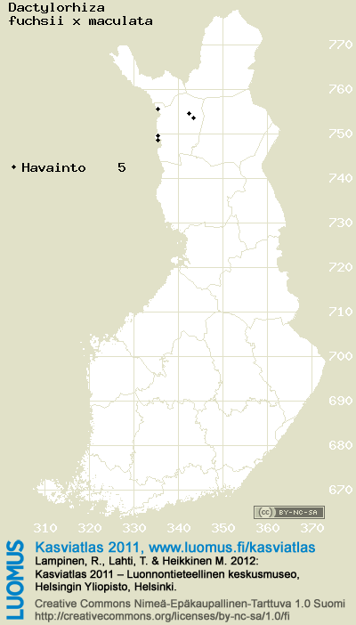 Tämä on vuoden 2011 kasviatlaksen karttasivu taksonista Dactylorhiza fuchsii x maculata. Tästä taksonista voi olla karttoja myös muissa atlaksen vuosiversioissa: 2018 / 2017 / 2016 / 2015 / 2014 / 2013 / 2012 / 2011 / 2010 / 2009 / 2008 / 2007 / 2006.