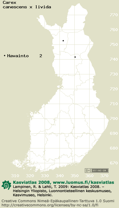 Tämä on vuoden 2008 kasviatlaksen karttasivu taksonista Carex canescens x livida. Tästä taksonista voi olla karttoja myös muissa atlaksen vuosiversioissa: 2018 / 2017 / 2016 / 2015 / 2014 / 2013 / 2012 / 2011 / 2010 / 2009 / 2008 / 2007 / 2006.