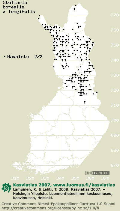 Tämä on vuoden 2006 kasviatlaksen karttasivu taksonista Stellaria borealis x longifolia. Tästä taksonista voi olla karttoja myös muissa atlaksen vuosiversioissa: 2018 / 2017 / 2016 / 2015 / 2014 / 2013 / 2012 / 2011 / 2010 / 2009 / 2008 / 2007 / 2006.