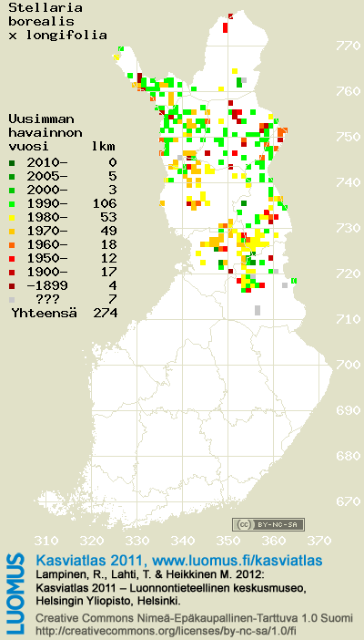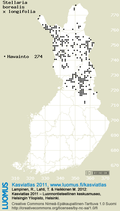 Tämä on vuoden 2011 kasviatlaksen karttasivu taksonista Stellaria borealis x longifolia. Tästä taksonista voi olla karttoja myös muissa atlaksen vuosiversioissa: 2018 / 2017 / 2016 / 2015 / 2014 / 2013 / 2012 / 2011 / 2010 / 2009 / 2008 / 2007 / 2006.