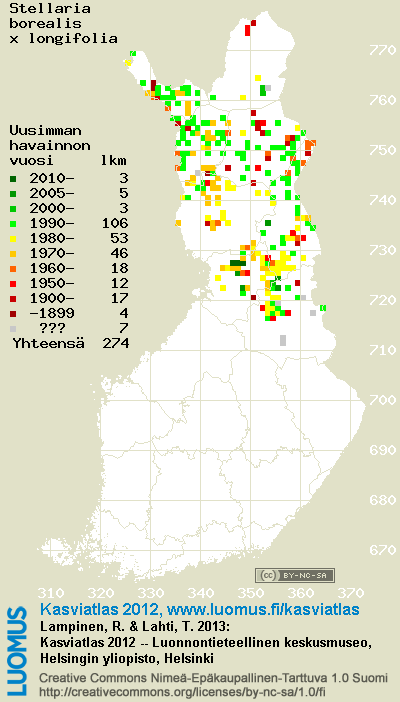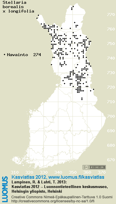Tämä on vuoden 2012 kasviatlaksen karttasivu taksonista Stellaria borealis x longifolia. Tästä taksonista voi olla karttoja myös muissa atlaksen vuosiversioissa: 2018 / 2017 / 2016 / 2015 / 2014 / 2013 / 2012 / 2011 / 2010 / 2009 / 2008 / 2007 / 2006.