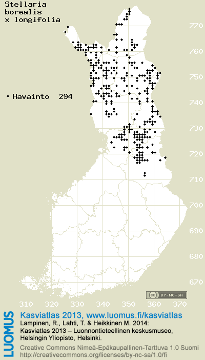 Tämä on vuoden 2013 kasviatlaksen karttasivu taksonista Stellaria borealis x longifolia. Tästä taksonista voi olla karttoja myös muissa atlaksen vuosiversioissa: 2018 / 2017 / 2016 / 2015 / 2014 / 2013 / 2012 / 2011 / 2010 / 2009 / 2008 / 2007 / 2006.
