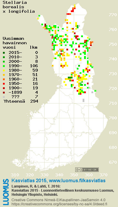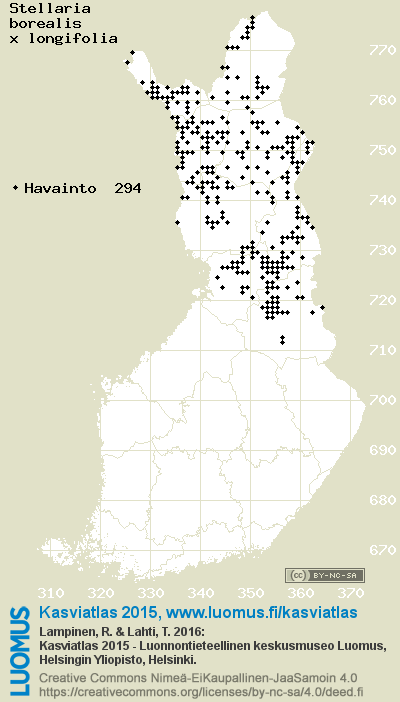 Tämä on vuoden 2015 kasviatlaksen karttasivu taksonista Stellaria borealis x longifolia. Tästä taksonista voi olla karttoja myös muissa atlaksen vuosiversioissa: 2018 / 2017 / 2016 / 2015 / 2014 / 2013 / 2012 / 2011 / 2010 / 2009 / 2008 / 2007 / 2006.