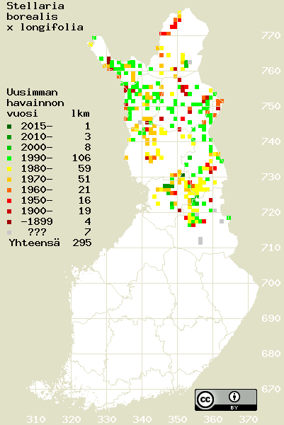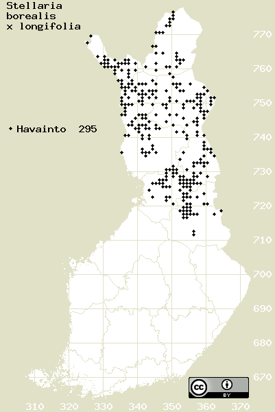 Tämä on vuoden 2016 kasviatlaksen karttasivu taksonista Stellaria borealis x longifolia. Tästä taksonista voi olla karttoja myös muissa atlaksen vuosiversioissa: 2018 / 2017 / 2016 / 2015 / 2014 / 2013 / 2012 / 2011 / 2010 / 2009 / 2008 / 2007 / 2006.
