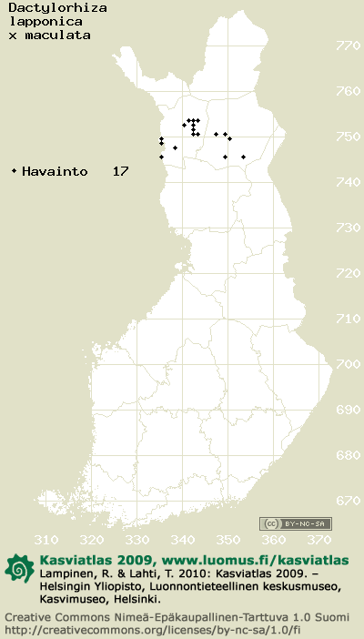 Tämä on vuoden 2009 kasviatlaksen karttasivu taksonista Dactylorhiza lapponica x maculata. Tästä taksonista voi olla karttoja myös muissa atlaksen vuosiversioissa: 2018 / 2017 / 2016 / 2015 / 2014 / 2013 / 2012 / 2011 / 2010 / 2009 / 2008 / 2007 / 2006.