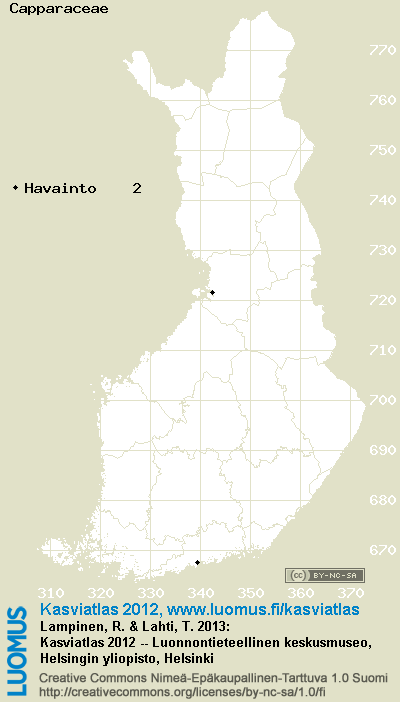 Tämä on vuoden 2012 kasviatlaksen karttasivu taksonista Capparaceae. Tästä taksonista voi olla karttoja myös muissa atlaksen vuosiversioissa: 2018 / 2017 / 2016 / 2015 / 2014 / 2013 / 2012 / 2011 / 2010 / 2009 / 2008 / 2007 / 2006.
