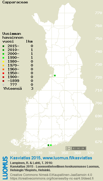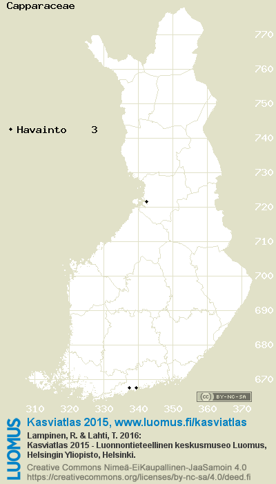 Tämä on vuoden 2015 kasviatlaksen karttasivu taksonista Capparaceae. Tästä taksonista voi olla karttoja myös muissa atlaksen vuosiversioissa: 2018 / 2017 / 2016 / 2015 / 2014 / 2013 / 2012 / 2011 / 2010 / 2009 / 2008 / 2007 / 2006.