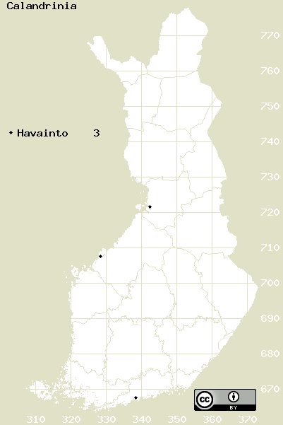 Tämä on vuoden 2017 kasviatlaksen karttasivu taksonista Calandrinia. Tästä taksonista voi olla karttoja myös muissa atlaksen vuosiversioissa: 2018 / 2017 / 2016 / 2015 / 2014 / 2013 / 2012 / 2011 / 2010 / 2009 / 2008 / 2007 / 2006.