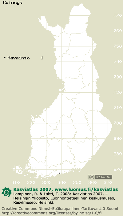 Tämä on vuoden 2006 kasviatlaksen karttasivu taksonista Coincya. Tästä taksonista voi olla karttoja myös muissa atlaksen vuosiversioissa: 2018 / 2017 / 2016 / 2015 / 2014 / 2013 / 2012 / 2011 / 2010 / 2009 / 2008 / 2007 / 2006.