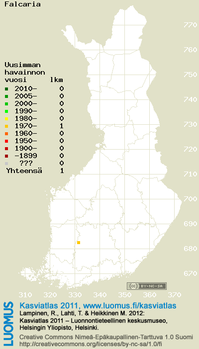 Tämä on vuoden 2011 kasviatlaksen karttasivu taksonista Falcaria. Tästä taksonista voi olla karttoja myös muissa atlaksen vuosiversioissa: 2018 / 2017 / 2016 / 2015 / 2014 / 2013 / 2012 / 2011 / 2010 / 2009 / 2008 / 2007 / 2006.