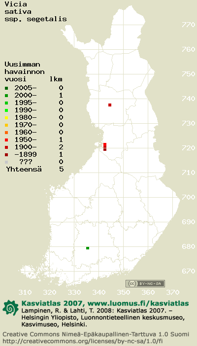 Tämä on vuoden 2007 kasviatlaksen karttasivu taksonista Vicia sativa ssp. segetalis. Tästä taksonista voi olla karttoja myös muissa atlaksen vuosiversioissa: 2018 / 2017 / 2016 / 2015 / 2014 / 2013 / 2012 / 2011 / 2010 / 2009 / 2008 / 2007 / 2006.