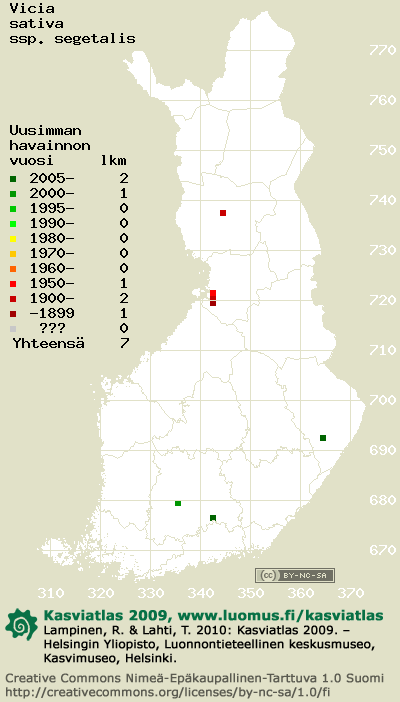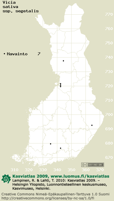 Tämä on vuoden 2009 kasviatlaksen karttasivu taksonista Vicia sativa ssp. segetalis. Tästä taksonista voi olla karttoja myös muissa atlaksen vuosiversioissa: 2018 / 2017 / 2016 / 2015 / 2014 / 2013 / 2012 / 2011 / 2010 / 2009 / 2008 / 2007 / 2006.