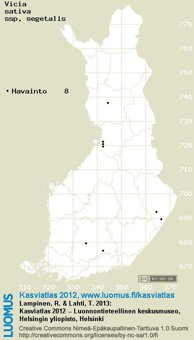 Tämä on vuoden 2012 kasviatlaksen karttasivu taksonista Vicia sativa ssp. segetalis. Tästä taksonista voi olla karttoja myös muissa atlaksen vuosiversioissa: 2018 / 2017 / 2016 / 2015 / 2014 / 2013 / 2012 / 2011 / 2010 / 2009 / 2008 / 2007 / 2006.