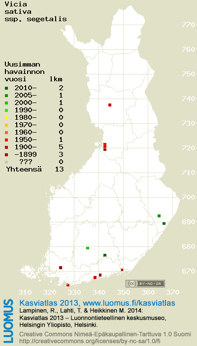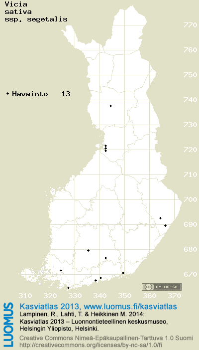 Tämä on vuoden 2013 kasviatlaksen karttasivu taksonista Vicia sativa ssp. segetalis. Tästä taksonista voi olla karttoja myös muissa atlaksen vuosiversioissa: 2018 / 2017 / 2016 / 2015 / 2014 / 2013 / 2012 / 2011 / 2010 / 2009 / 2008 / 2007 / 2006.