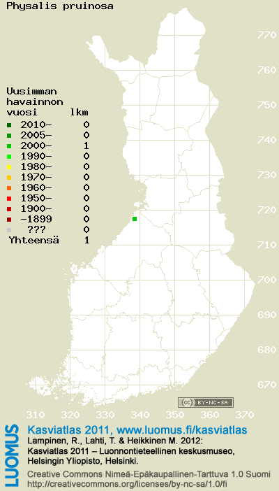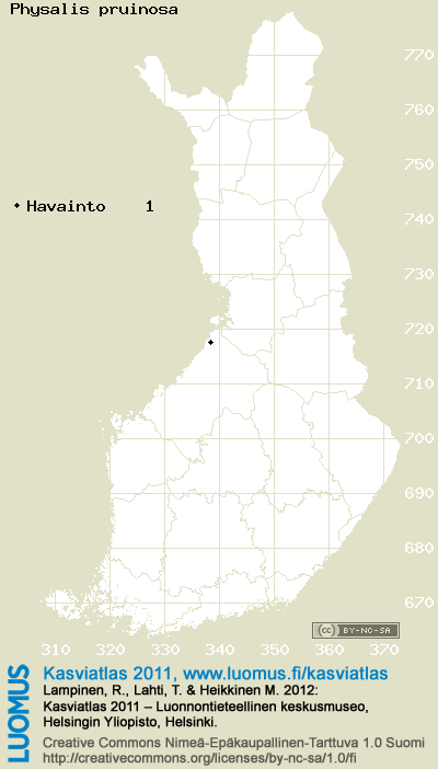 Tämä on vuoden 2011 kasviatlaksen karttasivu taksonista Physalis pruinosa. Tästä taksonista voi olla karttoja myös muissa atlaksen vuosiversioissa: 2018 / 2017 / 2016 / 2015 / 2014 / 2013 / 2012 / 2011 / 2010 / 2009 / 2008 / 2007 / 2006.