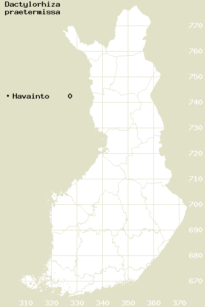 Tämä on jatkuvasti päivittyvä kasviatlaksen karttasivu taksonista Dactylorhiza praetermissa. Tästä taksonista voi olla karttoja eri vuosien atlaksissa: 2018 / 2017 / 2016 / 2015 / 2014 / 2013 / 2012 / 2011 / 2010 / 2009 / 2008 / 2007 / 2006.
