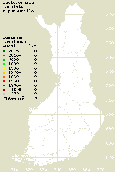 Tämä on jatkuvasti päivittyvä kasviatlaksen karttasivu taksonista Dactylorhiza maculata × purpurella. Tästä taksonista voi olla karttoja eri vuosien atlaksissa: 2018 / 2017 / 2016 / 2015 / 2014 / 2013 / 2012 / 2011 / 2010 / 2009 / 2008 / 2007 / 2006.