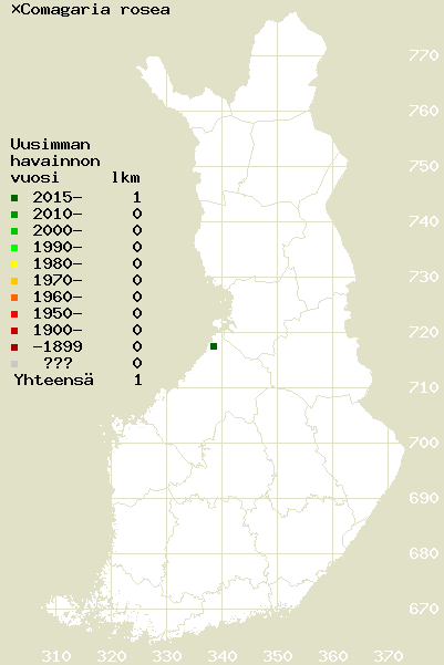 Tämä on jatkuvasti päivittyvä kasviatlaksen karttasivu taksonista ×Comagaria rosea. Tästä taksonista voi olla karttoja eri vuosien atlaksissa: 2018 / 2017 / 2016 / 2015 / 2014 / 2013 / 2012 / 2011 / 2010 / 2009 / 2008 / 2007 / 2006.