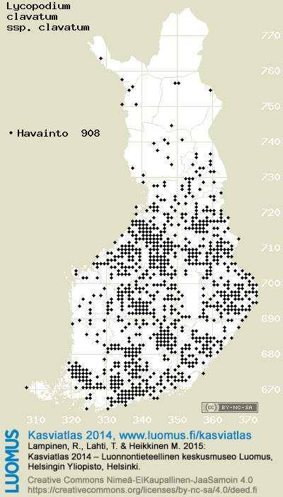 Tämä on vuoden 2014 kasviatlaksen karttasivu taksonista Lycopodium clavatum ssp. clavatum. Tästä taksonista voi olla karttoja myös muissa atlaksen vuosiversioissa: 2018 / 2017 / 2016 / 2015 / 2014 / 2013 / 2012 / 2011 / 2010 / 2009 / 2008 / 2007 / 2006.