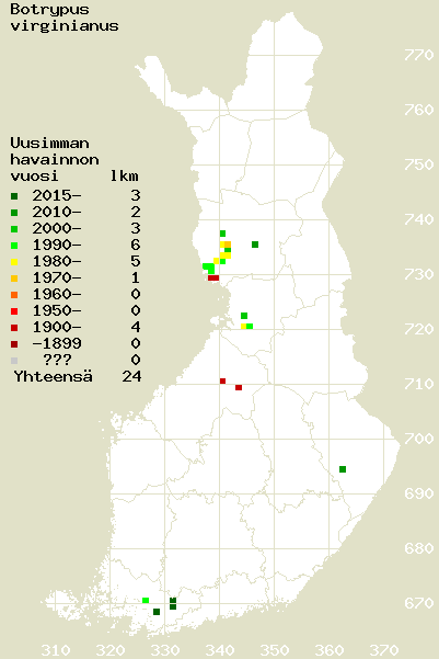 Tämä on jatkuvasti päivittyvä kasviatlaksen karttasivu taksonista Botrypus virginianus. Tästä taksonista voi olla karttoja eri vuosien atlaksissa: 2018 / 2017 / 2016 / 2015 / 2014 / 2013 / 2012 / 2011 / 2010 / 2009 / 2008 / 2007 / 2006.