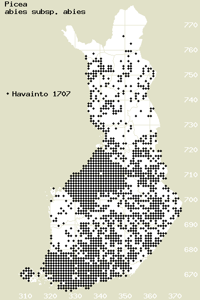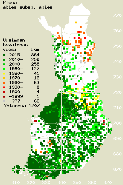 Tämä on jatkuvasti päivittyvä kasviatlaksen karttasivu taksonista Picea abies subsp. abies. Tästä taksonista voi olla karttoja eri vuosien atlaksissa: 2018 / 2017 / 2016 / 2015 / 2014 / 2013 / 2012 / 2011 / 2010 / 2009 / 2008 / 2007 / 2006.