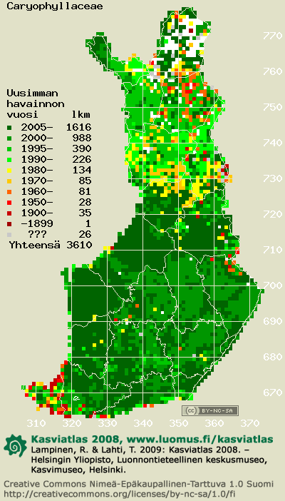 Tämä on vuoden 2008 kasviatlaksen karttasivu taksonista Caryophyllaceae. Tästä taksonista voi olla karttoja myös muissa atlaksen vuosiversioissa: 2018 / 2017 / 2016 / 2015 / 2014 / 2013 / 2012 / 2011 / 2010 / 2009 / 2008 / 2007 / 2006.