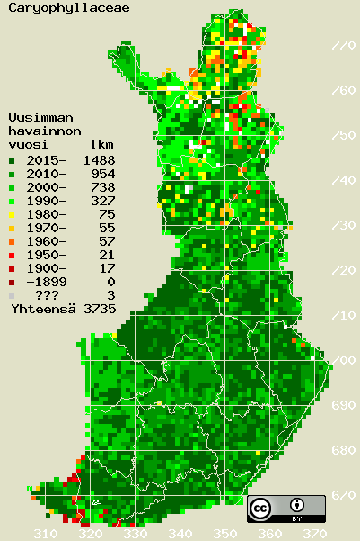 Tämä on vuoden 2018 kasviatlaksen karttasivu taksonista Caryophyllaceae. Tästä taksonista voi olla karttoja myös muissa atlaksen vuosiversioissa: 2018 / 2017 / 2016 / 2015 / 2014 / 2013 / 2012 / 2011 / 2010 / 2009 / 2008 / 2007 / 2006.