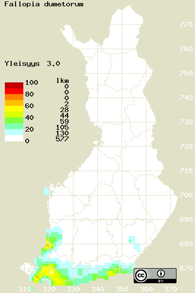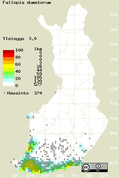 - yhdistelmäkartta, jossa on sekä yleisyys (prosenttifrekvenssi välillä 0-100) yhden km2:n ruuduissa maan eri osissa (väriasteikko) että herbaarionäytteisiin, kirjallisuuteen ja arkistotietoihin perustuvat yksittäishavainnot 10x10 km2:n ruuduista (avoympyrät).