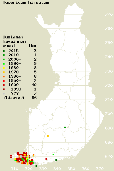 Tämä on jatkuvasti päivittyvä kasviatlaksen karttasivu taksonista Hypericum hirsutum. Tästä taksonista voi olla karttoja eri vuosien atlaksissa: 2018 / 2017 / 2016 / 2015 / 2014 / 2013 / 2012 / 2011 / 2010 / 2009 / 2008 / 2007 / 2006.