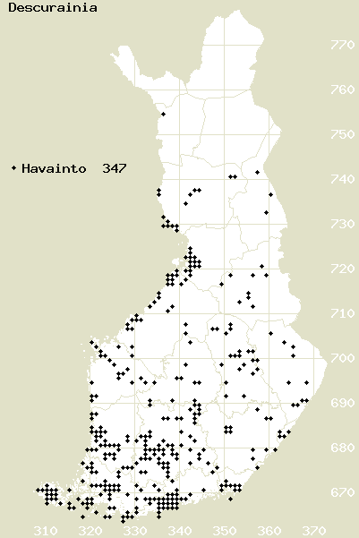 Tämä on jatkuvasti päivittyvä kasviatlaksen karttasivu taksonista Descurainia. Tästä taksonista voi olla karttoja eri vuosien atlaksissa: 2018 / 2017 / 2016 / 2015 / 2014 / 2013 / 2012 / 2011 / 2010 / 2009 / 2008 / 2007 / 2006.