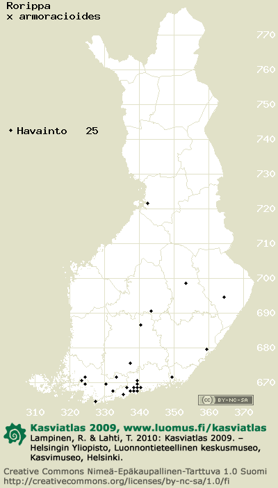 Tämä on vuoden 2009 kasviatlaksen karttasivu taksonista Rorippa x armoracioides. Tästä taksonista voi olla karttoja myös muissa atlaksen vuosiversioissa: 2018 / 2017 / 2016 / 2015 / 2014 / 2013 / 2012 / 2011 / 2010 / 2009 / 2008 / 2007 / 2006.