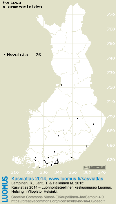 Tämä on vuoden 2014 kasviatlaksen karttasivu taksonista Rorippa x armoracioides. Tästä taksonista voi olla karttoja myös muissa atlaksen vuosiversioissa: 2018 / 2017 / 2016 / 2015 / 2014 / 2013 / 2012 / 2011 / 2010 / 2009 / 2008 / 2007 / 2006.