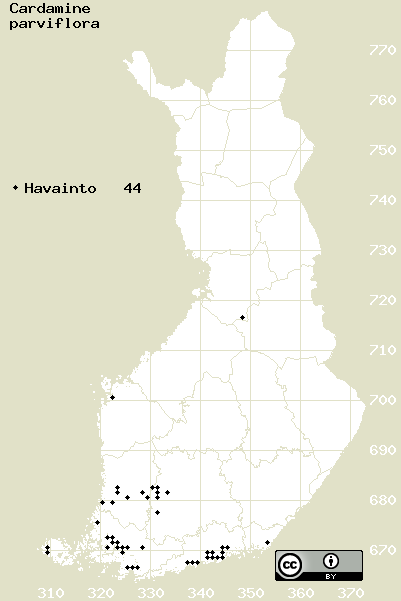 Tämä on vuoden 2017 kasviatlaksen karttasivu taksonista Cardamine parviflora. Tästä taksonista voi olla karttoja myös muissa atlaksen vuosiversioissa: 2018 / 2017 / 2016 / 2015 / 2014 / 2013 / 2012 / 2011 / 2010 / 2009 / 2008 / 2007 / 2006.
