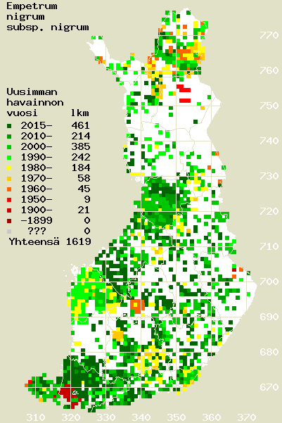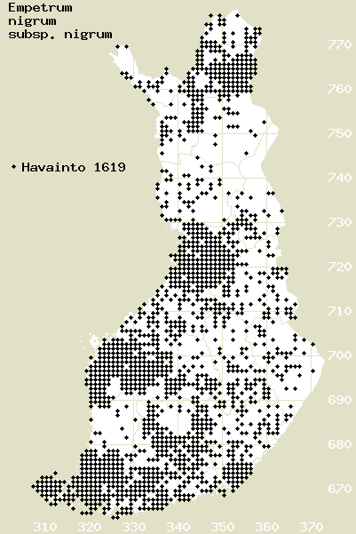 Tämä on jatkuvasti päivittyvä kasviatlaksen karttasivu taksonista Empetrum nigrum subsp. nigrum. Tästä taksonista voi olla karttoja eri vuosien atlaksissa: 2018 / 2017 / 2016 / 2015 / 2014 / 2013 / 2012 / 2011 / 2010 / 2009 / 2008 / 2007 / 2006.