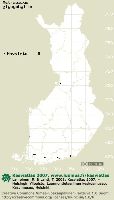 Tämä on vuoden 2006 kasviatlaksen karttasivu taksonista Astragalus glycyphyllos. Tästä taksonista voi olla karttoja myös muissa atlaksen vuosiversioissa: 2018 / 2017 / 2016 / 2015 / 2014 / 2013 / 2012 / 2011 / 2010 / 2009 / 2008 / 2007 / 2006.