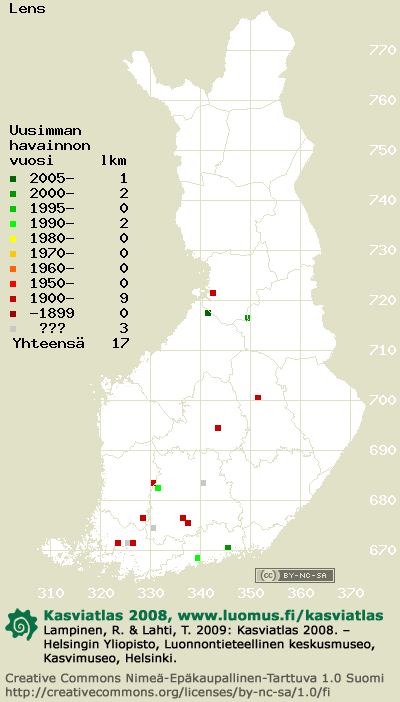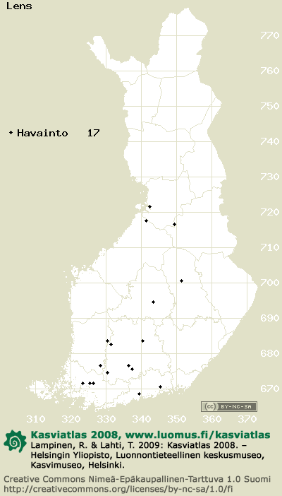 Tämä on vuoden 2008 kasviatlaksen karttasivu taksonista Lens. Tästä taksonista voi olla karttoja myös muissa atlaksen vuosiversioissa: 2018 / 2017 / 2016 / 2015 / 2014 / 2013 / 2012 / 2011 / 2010 / 2009 / 2008 / 2007 / 2006.