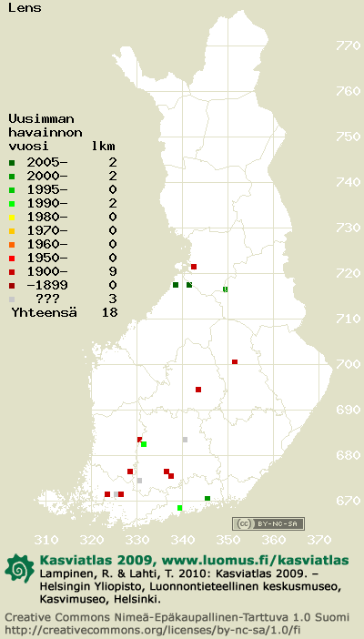 Tämä on vuoden 2009 kasviatlaksen karttasivu taksonista Lens. Tästä taksonista voi olla karttoja myös muissa atlaksen vuosiversioissa: 2018 / 2017 / 2016 / 2015 / 2014 / 2013 / 2012 / 2011 / 2010 / 2009 / 2008 / 2007 / 2006.